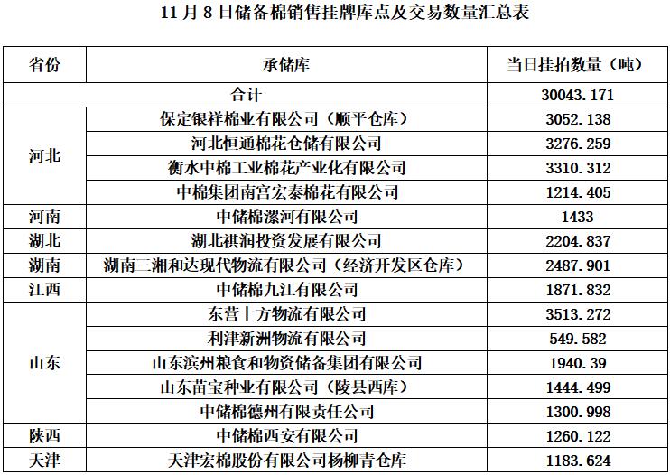 中國儲備棉管理有限公司定于11月8日通過全國棉花交易市場上市銷售中央儲備棉重量30043.171噸,共110捆。具體庫點及數(shù)量見下表。