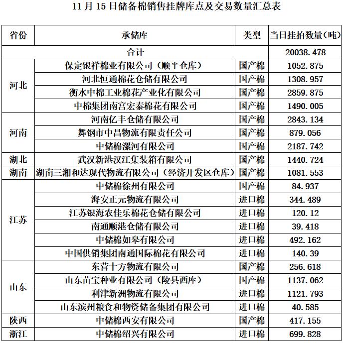 中國儲備棉管理有限公司定于11月15日通過全國棉花交易市場上市銷售中央儲備棉重量20038.478噸,共94捆。具體庫點及數量見下表。