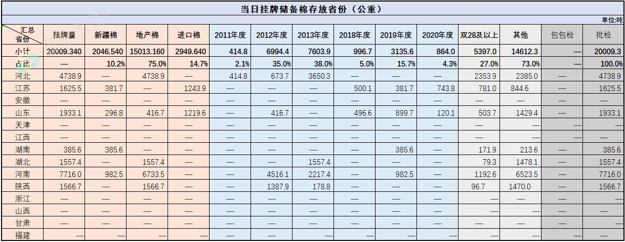 中國儲備棉管理有限公司定于11月23日通過全國棉花交易市場上市銷售中央儲備棉重量20009.34噸,共94捆。具體庫點及數(shù)量見下表。