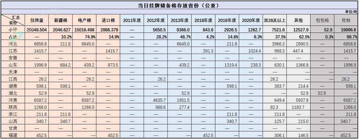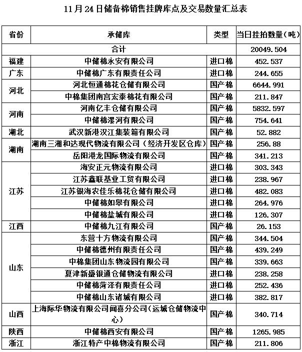 中國儲備棉管理有限公司定于11月24日通過全國棉花交易市場上市銷售中央儲備棉重量20049.504噸,共87捆。具體庫點(diǎn)及數(shù)量見下表。
