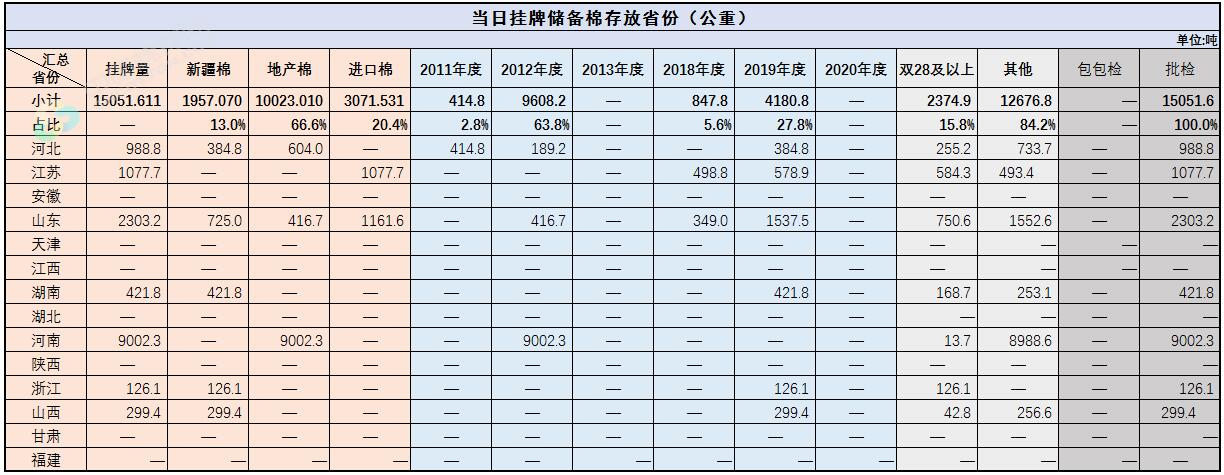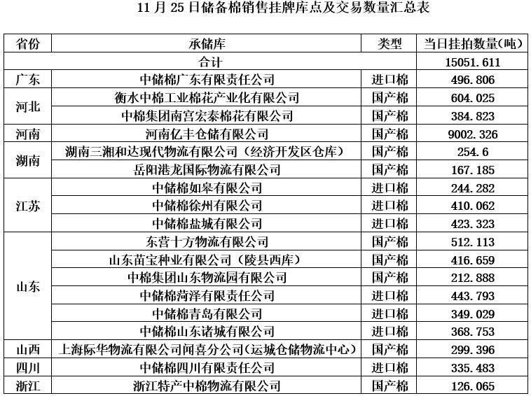 中國儲備棉管理有限公司定于11月25日通過全國棉花交易市場上市銷售中央儲備棉重量15051.611噸,共77捆。具體庫點及數(shù)量見下表。