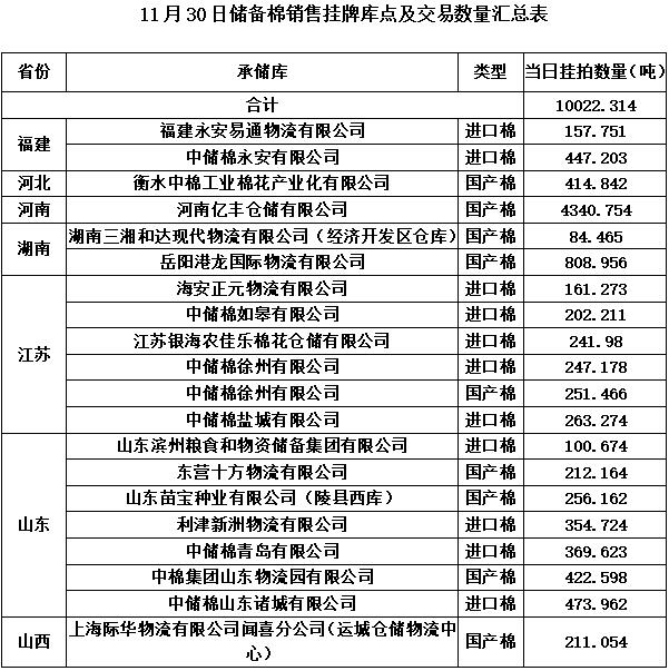 中國儲備棉管理有限公司定于11月30日通過全國棉花交易市場上市銷售中央儲備棉重量10022.314噸,共59捆。具體庫點及數(shù)量見下表。