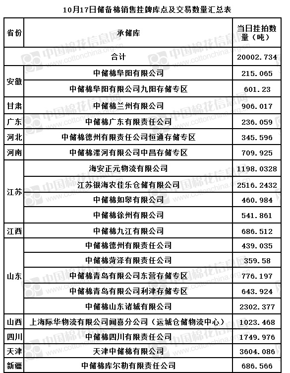 中國儲備棉管理有限公司定于10月17日通過全國棉花交易市場上市銷售儲備棉重量20002.734噸,共58捆。具體庫點及數(shù)量見下表。