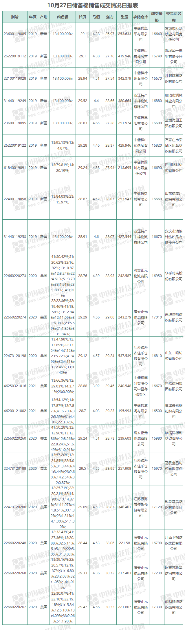 10月27日儲備棉銷售資源20000.4428噸,實際成交5932.3712噸,成交29.66%,成交均價16829元/噸,較前一日上漲167元/噸,折3128價格17245元/噸,較前一日上漲4元/噸。