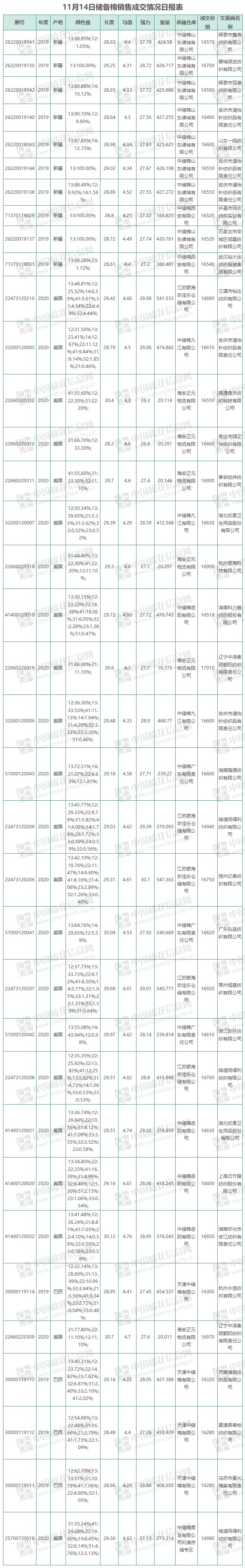 11月14日儲備棉銷售資源12004.3479噸,實際成交12004.3479噸,成交率100%,成交均價16594元/噸,較前一日上漲730元/噸,折3128價格16972元/噸,較前一日上漲649元/噸。