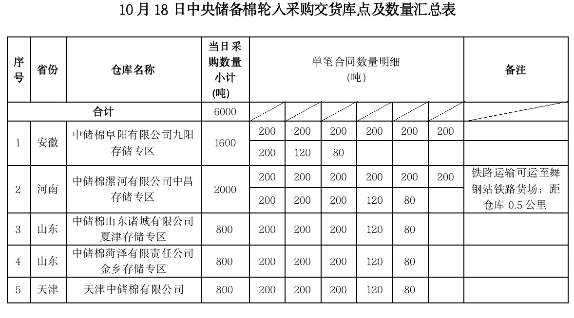 中國(guó)儲(chǔ)備棉管理有限公司定于2022年10月18日采購(gòu)棉花6000噸(公定重量)。具體庫(kù)點(diǎn)及數(shù)量如下: