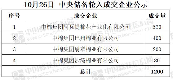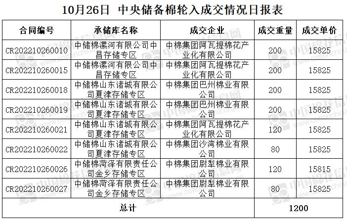 10月26日,中國儲(chǔ)備棉管理有限公司掛牌采購棉花6000噸(公定重量),實(shí)際成交1200噸,成交率20%,成交均價(jià)15824元/噸,成交最高價(jià)15825元/噸,成交最低價(jià)15815元/噸。