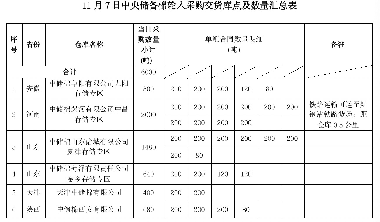 中國(guó)儲(chǔ)備棉管理有限公司定于2022年11月7日采購(gòu)棉花6000噸(公定重量)。具體庫(kù)點(diǎn)及數(shù)量如下: