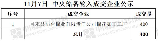 11月7日,中國(guó)儲(chǔ)備棉管理有限公司掛牌采購(gòu)棉花6000噸(公定重量),實(shí)際成交400噸,成交率7%,成交均價(jià)15450元/噸,成交最高價(jià)15450元/噸,成交最低價(jià)15450元/噸。
