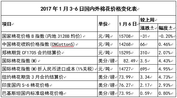1月6日,國際棉花指數(shù)(M)按折人民幣進(jìn)口成本14727元/噸(1%關(guān)稅,海關(guān)計(jì)征匯率,下同),低于國內(nèi)標(biāo)準(zhǔn)981元/噸,價(jià)差較上周縮小726元/噸;印度國內(nèi)S-6棉花折人民幣進(jìn)口成本13647元/噸,低于國內(nèi)2061元/噸,價(jià)差較上周縮小429元/噸;巴基斯坦國內(nèi)標(biāo)準(zhǔn)級(jí)棉花折人民幣進(jìn)口成本13244元/噸,低于國內(nèi)2696元/噸,價(jià)差較上周縮小232元/噸。