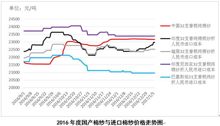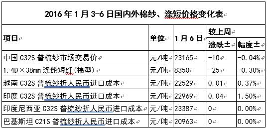 1月6日,越南32支普梳純棉紗22529元/噸(折人民幣進(jìn)口成本,下同),較中國國內(nèi)32支普梳純棉紗低636元/噸,價(jià)差較上周縮小91元/噸;印度32支普梳純棉紗22969元/噸,較中國國內(nèi)32支普梳純棉紗低196元/噸,價(jià)差較上周縮小344元/噸;印度尼西亞32支普梳純棉紗22610元/噸,較中國國內(nèi)32支普梳純棉紗低555元/噸,價(jià)差較上周縮小10元/噸。