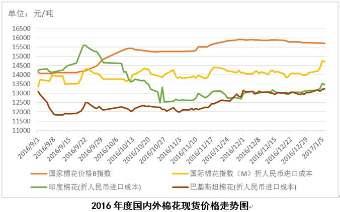 2016年12月23-29日,2016/17年度美棉出口凈簽約量為4.16萬噸,較前周減少47%,2016/17年度陸地棉裝運(yùn)量為5.72萬噸,較前周減少6%;美國《棉農(nóng)雜志》調(diào)查顯示,2017年美國意向植棉面積為1088.7萬英畝(6614萬畝),較USDA預(yù)測(cè)增長8%;印度棉花協(xié)會(huì)最新預(yù)測(cè)顯示,本年度印度棉花產(chǎn)量為586.5萬噸,同比增長2.07%,預(yù)計(jì)印度新棉供應(yīng)量將從1月份開始大量增加。