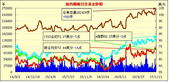 1月13日,市場在前一個交易日面對USDA(美國農(nóng)業(yè)部)報告意外利空情況下處于窄幅調(diào)整狀態(tài),近期3月合約結(jié)算價72.27美分/磅,跌7點;1705月合約72.76美分,跌9點;1712月合約70.9美分,跌20點。當(dāng)日行情整日平淡,3月合約早盤在72.2美分一線波動,交易中期短暫攀上72.6美分,后期回歸日內(nèi)低點,最終以微幅下跌收盤。分析師指出,USDA月報上調(diào)美棉出口量,但同時上調(diào)美棉產(chǎn)量和下調(diào)印度消費量,報告偏空,出乎一些人預(yù)期,市場還在消化報告作用。