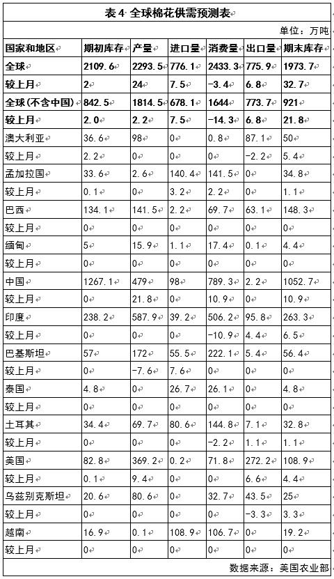 美國(guó)農(nóng)業(yè)部本月發(fā)布的全球棉花供需預(yù)測(cè)數(shù)據(jù)顯示,2016/17年度,全球棉花消費(fèi)量較上月有所調(diào)減,期初庫(kù)存、產(chǎn)量、進(jìn)口量、出口量、期末庫(kù)存均有所調(diào)增;中國(guó)以外棉花消費(fèi)量較上月有所調(diào)減,期初庫(kù)存、產(chǎn)量、進(jìn)口量、出口量、期末庫(kù)存均較上月有所調(diào)增;中國(guó)以外棉花產(chǎn)大于需170萬(wàn)噸,上月為154萬(wàn)噸,供應(yīng)過剩狀況略有好轉(zhuǎn)(見表4)。