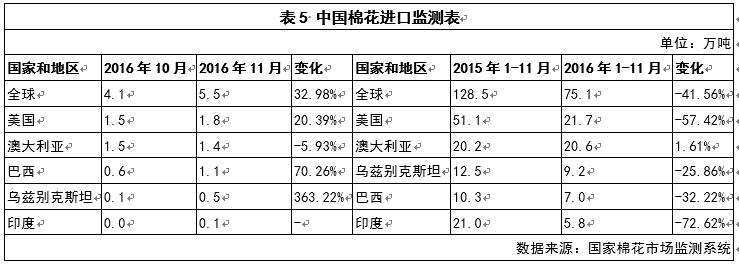 2016年11月,中國(guó)進(jìn)口棉花5.5萬(wàn)噸,較10月份減少32.98%;中國(guó)累計(jì)進(jìn)口棉花75.1萬(wàn)噸,同比減少41.56%,主要進(jìn)口來(lái)源為美國(guó)、澳大利亞、烏茲別克斯坦、巴西和印度(見表5)。