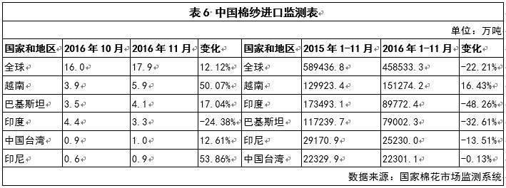 2016年11月,中國(guó)進(jìn)口棉紗17.9萬(wàn)噸,較10月份增加12.12%;2016年1-11月,中國(guó)累計(jì)進(jìn)口棉紗177.1萬(wàn)噸,同比減少18%,主要進(jìn)口來(lái)源為越南、巴基斯坦、印度、中國(guó)臺(tái)灣和印度尼西亞(見表6)。