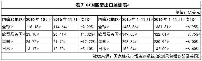 2016年11月,中國(guó)服裝出口金額114.64億美元,較10月份減少2.99%;2016年1-11月,中國(guó)累計(jì)服裝出口額口1361.81億美元,同比減少6.95%,主要出口市場(chǎng)為歐洲、美國(guó)和日本(見表7)。