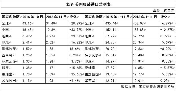 2016年11月,美國(guó)服裝進(jìn)口金額34.40億美元,較10月份減少20.29%;2016年1-11月,美國(guó)累計(jì)服裝進(jìn)口額口408.07億美元,同比減少6.29%,主要進(jìn)口來(lái)源為中國(guó)、越南、印度尼西亞、洪都拉斯、洪都拉斯、薩爾瓦多、印度、柬埔寨和孟加拉國(guó)(見表9)。