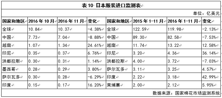 2016年11月,日本服裝進(jìn)口金額10.37億美元,較10月份減少4.38%;2016年1-11月,日本累計(jì)服裝進(jìn)口額口119.98億美元,同比減少2.13%,主要進(jìn)口來(lái)源為中國(guó)、越南、印度尼西亞、洪都拉斯、洪都拉斯、薩爾瓦多、印度和柬埔寨(見表10)。