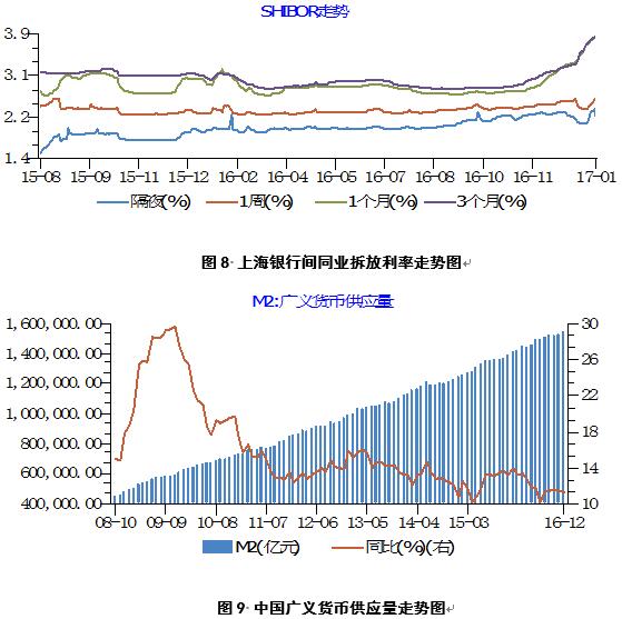 2016年12月31日,中國(guó)廣義貨幣供應(yīng)量155萬(wàn)億,環(huán)比增加2萬(wàn)億,同比增加16萬(wàn)億(見圖9)。