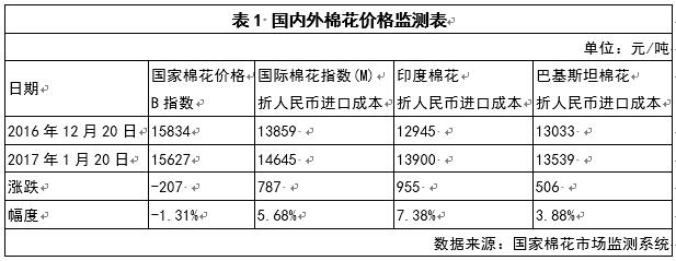 一個(gè)月以來(lái),國(guó)內(nèi)棉花價(jià)格持續(xù)下跌,國(guó)外棉花價(jià)格普遍上漲,其中印、巴棉價(jià)漲幅較大,明顯高于外棉平均價(jià)格水平。內(nèi)外棉價(jià)差由1975元/噸縮小至982元/噸(見表1、圖1、圖2、圖3)。