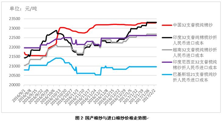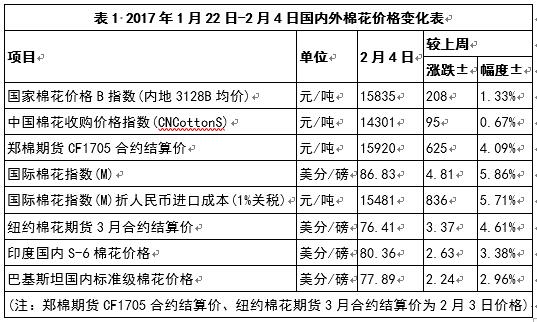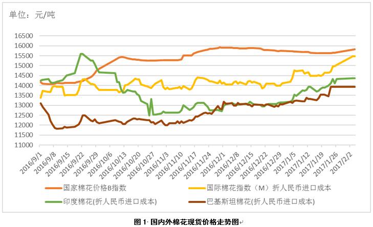 春節(jié)期間,國(guó)際棉價(jià)整體較大幅上漲。截至1月26日,2016/17年度美國(guó)棉花簽約銷(xiāo)售量累計(jì)達(dá)到231.2萬(wàn)噸,同比增加93萬(wàn)噸,增長(zhǎng)67%;美國(guó)國(guó)內(nèi)七大市場(chǎng)M級(jí)現(xiàn)貨平均價(jià)格較前周上漲0.70美分/磅。ICAC2月月報(bào)預(yù)測(cè)調(diào)減2016/17度印巴棉花產(chǎn)量,印巴棉花價(jià)格進(jìn)一步上漲。