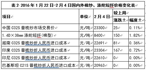 春節(jié)后,國(guó)內(nèi)棉紗價(jià)格繼續(xù)小幅上漲,滌綸短纖價(jià)格止跌上漲;國(guó)際棉紗價(jià)格持續(xù)上漲,印度、越南棉紗價(jià)格上漲明顯,印尼、巴基斯坦棉紗價(jià)格相對(duì)平穩(wěn)(見(jiàn)表2)。