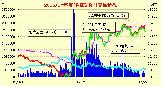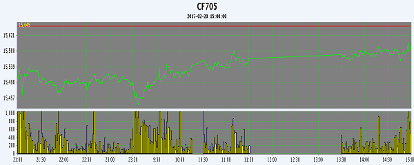 2月20日,隔夜鄭棉CF1705合約弱市震蕩,今日早盤下探后在空頭回補推動下回升,日線形成1/2下影線的小陽線。日內(nèi)成交量萎縮,持倉量減少。基本面情況:對于3月6日儲備棉輪出啟動后棉花市場的走向,紡織廠、貿(mào)易商、棉花加工企業(yè)的分歧比較大,各方關(guān)注的重點是儲備棉中“高品質(zhì)、高等級棉花” 的比例、貿(mào)易商是否不受任何限制的參與儲備棉競賣及儲備棉公檢、出庫裝卸能力是否“給力”上。