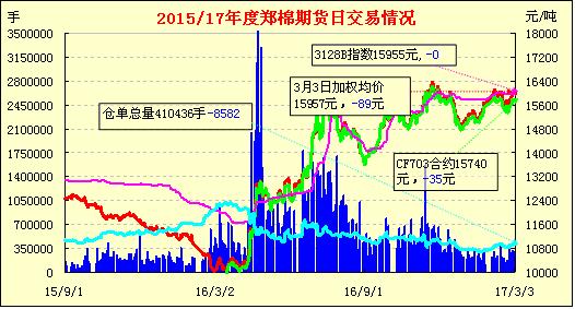 3月3日,隔夜鄭棉CF1705合約上試回落,今日早盤(pán)受外棉下跌影響迅速下探創(chuàng)日低,隨后空頭回補(bǔ)推動(dòng)期價(jià)震蕩上行,終盤(pán)收復(fù)前日全部跌幅,日線形成長(zhǎng)下影線的陽(yáng)線星。日內(nèi)成交量放大,持倉(cāng)量減少。基本面情況:疆內(nèi)4128B2級(jí)機(jī)采棉也較為走俏,成交價(jià)格一般在15450元/噸(毛重自提)左右。湖北大包地產(chǎn)棉也迎來(lái)走貨高峰期,仙桃某廠皮棉級(jí)別多為4129C2級(jí),近來(lái)以15400元/噸的價(jià)格走貨不少,目前廠內(nèi)尚余10車(chē)地產(chǎn)棉,吸引部分中小型紡企前來(lái)看貨。