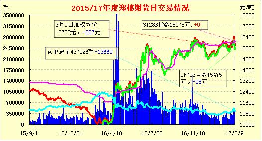3月9日,隔夜鄭棉CF1705合約在空頭回補(bǔ)推動(dòng)下反彈,今日早盤在多頭平倉(cāng)壓制下回落,隨后探低回升盤整,午后在平倉(cāng)壓制下走低,日線形成小陰線。日內(nèi)成交量萎縮,持倉(cāng)量減少?;久媲闆r:新疆手摘雙29級(jí)內(nèi)地提貨價(jià)在16500-16700元/噸,3128級(jí)機(jī)采棉價(jià)格在16200-16300元/噸。而從今日第一節(jié)儲(chǔ)備棉拍儲(chǔ)情況看,熱情度略有減弱,最高加價(jià)在1940元/噸,較昨日最高加價(jià)低了800元/噸。而期貨上價(jià)格也呈現(xiàn)調(diào)整,經(jīng)過(guò)昨日強(qiáng)勢(shì)上拉后,部分產(chǎn)業(yè)客戶如軋花廠高位賣套心態(tài)增強(qiáng)。
