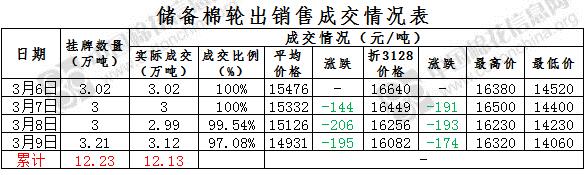 3月9日儲(chǔ)備棉輪出銷(xiāo)售資源32090.68噸,實(shí)際成交31151.243噸,成交率97.08%。當(dāng)日最高成交價(jià)16320元/噸(2012年度新疆棉),最低成交價(jià)14060元/噸(2012年度地產(chǎn)棉)。成交平均價(jià)格14931元/噸(較前一日價(jià)格下降195元/噸);折3128價(jià)格:16082元/噸(較前一日價(jià)格下降174元/噸)。當(dāng)日單捆最高加價(jià)2100元/噸(2012年度新疆棉),單捆最低加價(jià)20元/噸(2012年度地產(chǎn)棉4捆,2013年度地產(chǎn)棉3捆)。