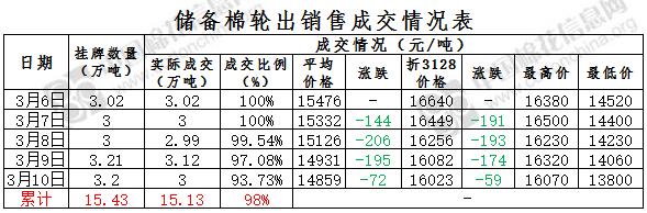 3月10日儲備棉輪出銷售資源32001.452噸,實際成交29995.004噸,成交率93.73%。當日最高成交價16070元/噸(2012年度新疆棉),最低成交價13800元/噸(2012年度地產(chǎn)棉)。成交平均價格14859元/噸(較前一日價格下降72元/噸);折3128價格:16023元/噸(較前一日價格下降59元/噸)。當日單捆最高加價1840元/噸(2012年度新疆棉),單捆最低加價20元/噸(2011年度地產(chǎn)棉2捆,2012年度地產(chǎn)棉8捆,2013年度地產(chǎn)棉4捆)。