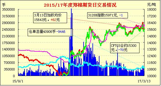 3月13日鄭棉早盤在空頭回補(bǔ)推動下回升震蕩,午后受到集中平倉打壓下滑,日線長陽線星。日內(nèi)成交量萎縮,持倉量減少?;久媲闆r:河南、山東、江蘇等地的紡企反映,今年北疆機(jī)采棉在品質(zhì)、異纖、軋工質(zhì)量等方面較前兩個年度有較為明顯的提升,部分廠家“雙29/雙30/雙31”的占比甚至達(dá)到70%以上;而且由于嚴(yán)格控制籽棉收購、調(diào)節(jié)水份加工,因此機(jī)采棉雜質(zhì)含量一般降至2%(個別軋花廠低于1.8%),與手采棉的差距縮小至1%左右,但1-3月份疆內(nèi)市場同品級、同品質(zhì)手采棉的價格高于機(jī)采棉300-400元/噸,因此無論紡織企業(yè)還是貿(mào)易商都更愿意采購機(jī)采棉。