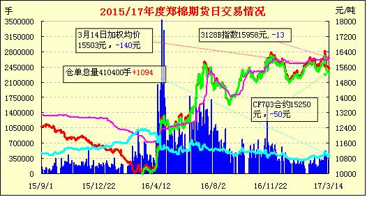 3月14日隔夜鄭棉CF1705合約沖高回落,今日早盤(pán)橫向震蕩,午后空頭集中賣(mài)盤(pán)打壓下走低,日線陰線。日內(nèi)成交量放大,持倉(cāng)量減少?;久媲闆r:菏澤地區(qū)信息員走訪了巨野、成武地區(qū)部分軋花廠。在軋花廠門(mén)口,信息員看到三五成群的棉農(nóng)在聊天,從他們的談話中得知,這兩天棉農(nóng)準(zhǔn)備購(gòu)買(mǎi)棉種,再過(guò)些天,就開(kāi)始播種。去年,棉農(nóng)對(duì)產(chǎn)量很不滿(mǎn)意。主要是雨水大,今年希望不要再有大的自然災(zāi)害。據(jù)了解,成武、巨野地區(qū)土地肥沃,適合套種棉花。去年主要是水災(zāi)嚴(yán)重,每畝棉花產(chǎn)量在460斤左右,今年棉花種植面積基本與去年持平。