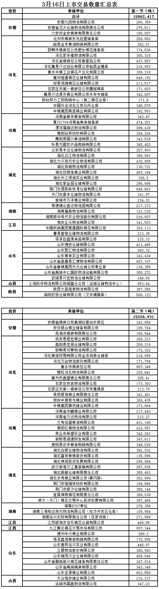 3月16日兩節(jié)共計(jì)輪出儲(chǔ)備棉31089.348噸。