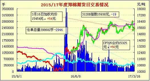 3月16日,隔夜鄭棉CF1705合約回升,今日早盤(pán)慣性沖高后在平倉(cāng)盤(pán)壓制下回落,午后橫向震蕩,日線形成小陽(yáng)線。日內(nèi)成交量萎縮,持倉(cāng)量減少。基本面情況:安徽東至監(jiān)測(cè)站對(duì)安徽東至棉花主產(chǎn)區(qū)進(jìn)行了2017年棉花播種面積意向調(diào)查。調(diào)查對(duì)象30戶(hù),30戶(hù)棉農(nóng)共有土地216畝。其中,種棉共140畝,其余76畝用來(lái)種玉米等雜糧。當(dāng)問(wèn)及2016年棉花價(jià)格上漲了,為什么不多種棉花時(shí),大部分棉農(nóng)說(shuō),雖然2016年棉花價(jià)格上漲了,但種棉收益并不高。受雨水影響,產(chǎn)量、質(zhì)量大幅下降,除山區(qū)少量單產(chǎn)在200公斤左右外,平原一帶基本只有100公斤左右,能達(dá)到單產(chǎn)150公斤的很少。籽棉3級(jí)的基本沒(méi)有,最好的也只達(dá)4級(jí)。因此,盡管籽棉價(jià)格上漲,但棉農(nóng)的收益不高。另外,還有部分棉農(nóng)因種棉花收益沒(méi)有保障,愿意把地租出去,租金一畝500元。由于距種棉時(shí)間越來(lái)越近,棉農(nóng)都在關(guān)心棉種以及生產(chǎn)資料的價(jià)格。