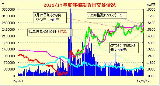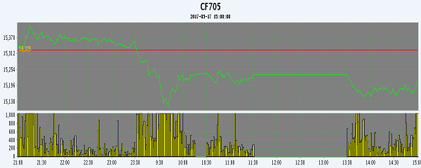 3月17日,隔夜鄭棉CF1705合約盤整,今日早盤在空頭賣盤打壓下回落,隨后在空頭回補(bǔ)的支撐下脫離低點震蕩,日線形成陰線。日內(nèi)成交量放大,持倉量增加?;久媲闆r:據(jù)調(diào)查,2017年山東魯西南棉區(qū)棉花種植面積較2016年有小幅回升。菏澤市成武縣大田集申樓村棉農(nóng)講,申樓村是大蒜主產(chǎn)區(qū),蒜棉套種也是主要種植模式之一。全村有4000畝耕地,2016年蒜棉套種大約3000畝左右。由于2016年棉花豐收,棉農(nóng)得到了收益,今年將保持棉花種植面積。
