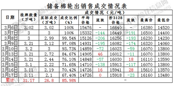 3月17日儲備棉輪出銷售資源31080.422噸,實際成交20948.569噸,成交率67.40%。當日最高成交價16160元/噸(2012年度新疆棉),最低成交價13480元/噸(2013年度地產(chǎn)棉)。成交平均價格14726元/噸(較前一日價格持平);折3128價格:15918元/噸(較前一日價格跌23元/噸)。當日單捆最高加價1520元/噸(2012年度新疆棉),單捆最低加價20元/噸(2011年度地產(chǎn)棉1捆;2012年度地產(chǎn)棉10捆,新疆棉1捆;2013年度地產(chǎn)棉6捆,新疆棉7捆)。