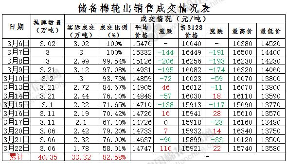 3月22日儲備棉輪出銷售資源30637.6654噸,實際成交17771.551噸,成交率58.01%。當日最高成交價15740元/噸(2012年度新疆棉),最低成交價13580元/噸(2012年度地產(chǎn)棉)。成交平均價格14747元/噸(較前一日價格漲110元/噸);折3128價格:15921元/噸(較前一日價格漲22元/噸)。當日單捆最高加價1800元/噸(2013年度新疆棉),單捆最低加價20元/噸(2011年度地產(chǎn)棉1捆;2012年度地產(chǎn)棉11捆;2013年度地產(chǎn)棉6捆,新疆棉1捆)。