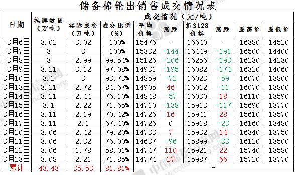 3月23日儲備棉輪出銷售資源30812.607噸,實際成交22139.925噸,成交率71.85%。當日最高成交價15720元/噸(2012年度新疆棉),最低成交價13770元/噸(2012年度地產(chǎn)棉)。成交平均價格14774元/噸(較前一日價格漲27元/噸);折3128價格:15987元/噸(較前一日價格漲66元/噸)。當日單捆最高加價1300元/噸(2013年度新疆棉),單捆最低加價20元/噸(2012年度地產(chǎn)棉7捆;2013年度地產(chǎn)棉2捆,新疆棉2捆)。