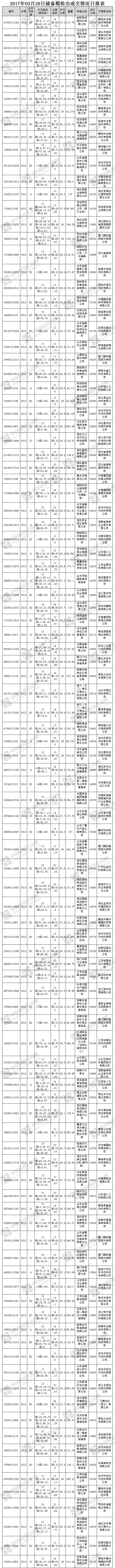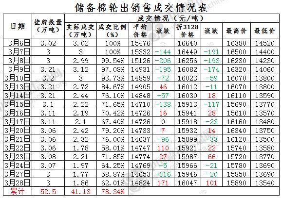 3月28日儲備棉輪出銷售資源30044.554噸,實(shí)際成交18629.315噸,成交率62.01%。當(dāng)日最高成交價15890元/噸(2012年度新疆棉),最低成交價13540元/噸(2013年度地產(chǎn)棉)。成交平均價格14824元/噸(較前一日價格漲171元/噸);折3128價格:16047元/噸(較前一日價格漲101元/噸)。當(dāng)日單捆最高加價2040元/噸(2012年度新疆棉),單捆最低加價20元/噸(2012年度地產(chǎn)棉6捆;2013年度地產(chǎn)棉5捆,新疆棉2捆)。