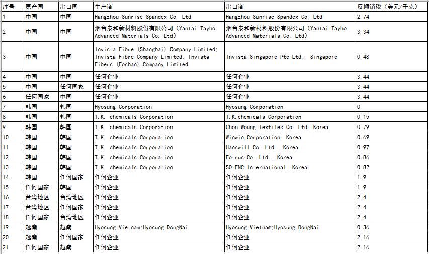 2017年3月24日,印度商工部發(fā)布公告稱,對(duì)進(jìn)口自中國大陸、臺(tái)灣地區(qū)、韓國、越南的彈性紗線(ElastomericFilamentYarn)作出反傾銷終裁,建議對(duì)中國大陸、臺(tái)灣地區(qū)、韓國和越南的涉案產(chǎn)品分別征收0.48~3.34美元/千克、2.40美元/千克、0~1.90美元/千克、0.36~2.16美元/千克的反傾銷稅,詳見下表。涉案產(chǎn)品的印度海關(guān)編碼為54041100。