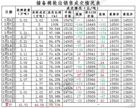 3月31日儲備棉輪出銷售資源30018.171噸,實際成交17466.594噸,成交率58.19%。當日最高成交價15920元/噸(2012年度新疆棉),最低成交價13570元/噸(2013年度地產(chǎn)棉)。成交平均價格14773元/噸(較前一日價格跌38元/噸);折3128價格:15969元/噸(較前一日價格漲40元/噸)。當日單捆最高加價1940元/噸(2012年度新疆棉),單捆最低加價20元/噸(2012年度地產(chǎn)棉5捆,新疆棉1捆;2013年度地產(chǎn)棉3捆)。