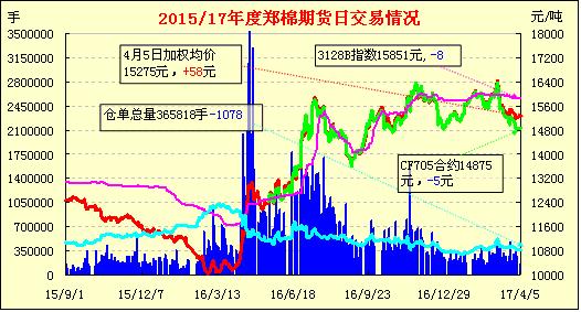 4月5日,鄭棉CF1709合約低開后在多頭買盤推動下回升,日線形成陽線。日內(nèi)成交量萎縮,持倉量增加。基本面情況:市場呈現(xiàn)調(diào)整,走貨相對不暢,商家為出貨放大優(yōu)惠促銷力度,河北一企業(yè)地產(chǎn)3128級大包價格在15300-15500元/噸自提,4128級在14900元/噸左右。商家儲備棉銷售較多,手摘疆棉1328級強(qiáng)度29左右張家港庫報價在15800元/噸左右,整體成交相對不多,紡企采購謹(jǐn)慎。