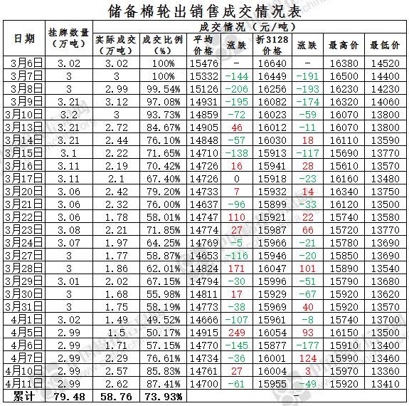4月11日儲備棉輪出銷售資源29943.115噸,實際成交26174.012噸,成交率87.41%。當(dāng)日最高成交價15920元/噸(2012年度新疆棉),最低成交價13410元/噸(2013年度地產(chǎn)棉)。成交平均價格14700元/噸(較前一日價格跌61元/噸);折3128價格:15955元/噸(較前一日價格跌49元/噸)。當(dāng)日單捆最高加價1860元/噸(2013年度新疆棉),單捆最低加價20元/噸(2013年度地產(chǎn)棉3捆)。