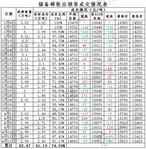 4月12日儲備棉輪出銷售資源29893.275噸,實際成交24264.929噸,成交率81.17%。當日最高成交價15810元/噸(2013年度新疆棉),最低成交價13420元/噸(2013年度地產(chǎn)棉)。成交平均價格14663元/噸(較前一日價格跌37元/噸);折3128價格:15911元/噸(較前一日價格跌44元/噸)。當日單捆最高加價1440元/噸(2013年度新疆棉),單捆最低加價20元/噸(2012年度地產(chǎn)棉6捆;2013年度地產(chǎn)棉9捆,新疆棉1捆)。