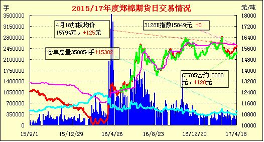 4月18日隔夜鄭棉CF1709合約上漲,今日早盤在多頭買盤推動下沖高,隨后高位震蕩,日線形成陽線。日內(nèi)成交量放大,持倉量增加?;久媲闆r:現(xiàn)貨價格相對穩(wěn)定,棉花現(xiàn)貨市場調(diào)整,內(nèi)地庫3128級公定價15600-16200元/噸左右,受碼值強力等影響有一定差距,兵團(tuán)價格高300-500元/噸。新疆站臺3129/30級機采棉價格在15400-15600元/噸毛重,部分質(zhì)優(yōu)中期棉價格堅挺,略有惜售,整體市場棉花庫存消化緩慢。