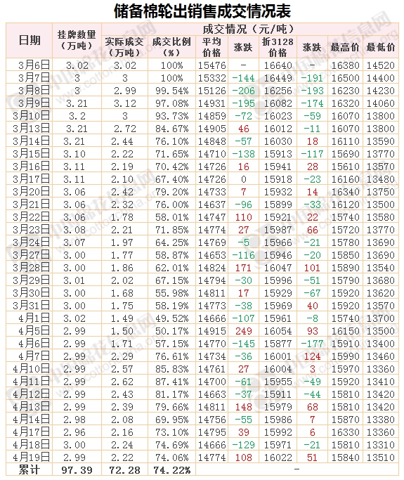 4月19日儲(chǔ)備棉輪出銷售資源29946.741噸,實(shí)際成交22178.969噸,成交率74.06%。當(dāng)日最高成交價(jià)15840元/噸(2012年度新疆棉),最低成交價(jià)13510元/噸(2012年度地產(chǎn)棉)。成交平均價(jià)格14774元/噸(較前一日價(jià)格漲108元/噸);折3128價(jià)格:16022元/噸(較前一日價(jià)格漲51元/噸)。當(dāng)日單捆最高加價(jià)2040元/噸(2013年度新疆棉),單捆最低加價(jià)20元/噸(2011年度地產(chǎn)棉1捆;2012年度地產(chǎn)棉8捆;2013年度地產(chǎn)棉9捆)。