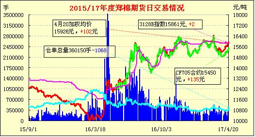4月20日隔夜鄭棉CF1709合約沖高后在平倉盤壓制下回落,今日早盤震蕩盤跌,午后多頭買盤回歸,期價(jià)隨之脫離低點(diǎn)反轉(zhuǎn)上行,日線形成長(zhǎng)下影線的陽線。日內(nèi)成交量放大,持倉量增加?;久媲闆r:目前棉花現(xiàn)貨價(jià)格在16500元/噸左右,滌綸短纖價(jià)格7800元/噸一線,基本保持穩(wěn)定,粘膠短纖價(jià)格有小幅調(diào)整,目前大廠家貨源基本在15800元/噸的水平。面對(duì)粘膠短纖價(jià)格的波動(dòng),山東某紡企反饋,早已基本談好的粘膠紗品種,客戶遲遲不肯下單,一直在觀望粘膠原料的價(jià)格走勢(shì)。而由原料價(jià)格變化導(dǎo)致市場(chǎng)不見訂單的現(xiàn)象一直以來都比較明顯??傮w來講,目前常規(guī)紗線市場(chǎng)表現(xiàn)相對(duì)冷清,特種紡紗比較穩(wěn)定。