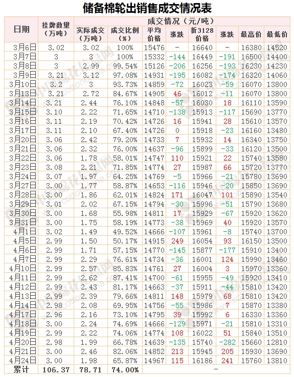 4月24日儲(chǔ)備棉輪出銷售資源29991.338噸,實(shí)際成交19755.105噸,成交率65.87%。當(dāng)日最高成交價(jià)15760元/噸(2012年度新疆棉),最低成交價(jià)13810元/噸(2013年度地產(chǎn)棉)。成交平均價(jià)格14967元/噸(較前一日價(jià)格漲115元/噸);折3128價(jià)格:16186元/噸(較前一日價(jià)格漲241元/噸)。當(dāng)日單捆最高加價(jià)1540元/噸(2013年度新疆棉),單捆最低加價(jià)20元/噸(2012年度地產(chǎn)棉6捆,新疆棉1捆;2013年度地產(chǎn)棉8捆)。